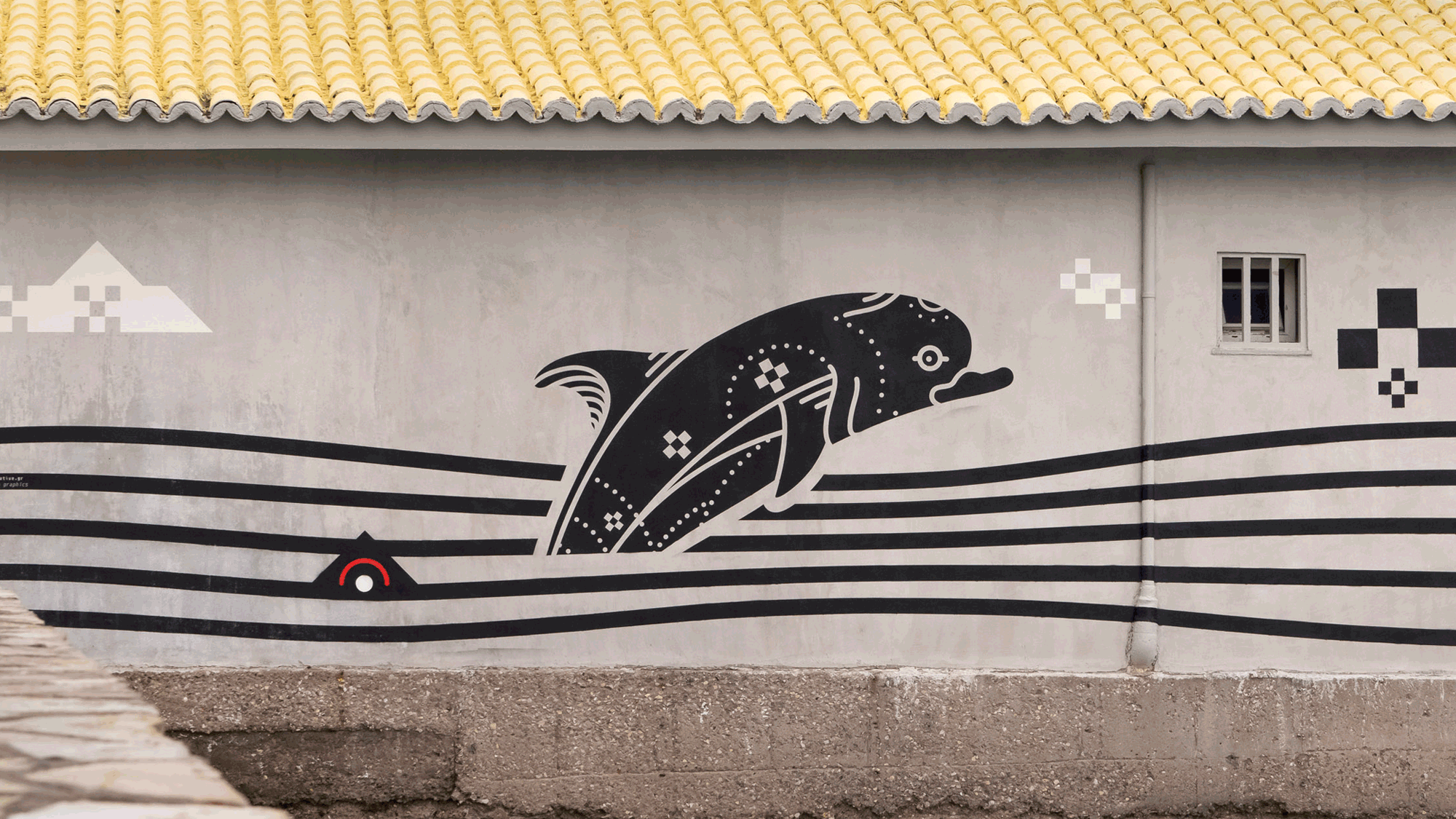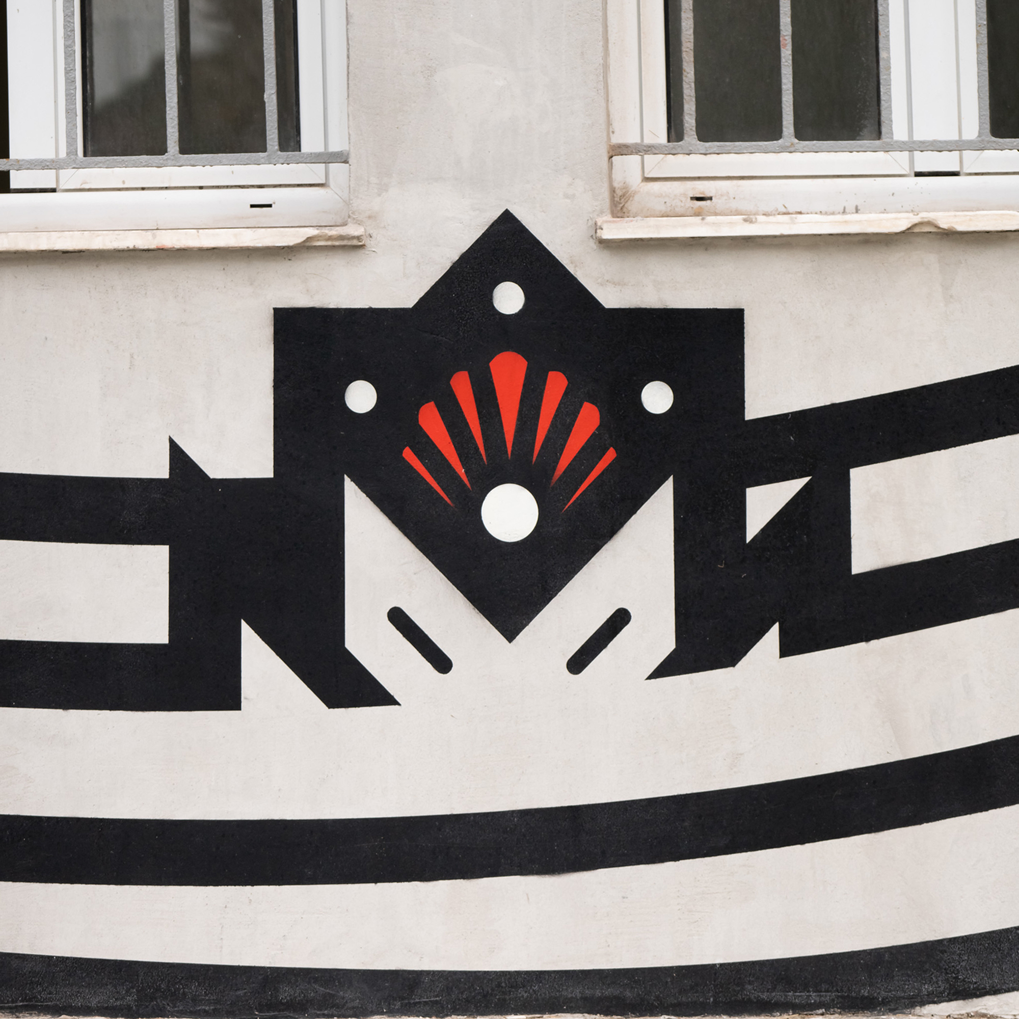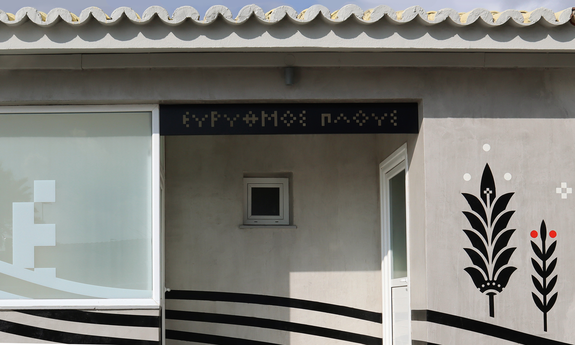 The dominant element, which like a thread unifies the mural composition, is the sea. In a rhythmic way it surrounds the base of the buildings, referring to a musical staff from which the flowers of the sea emerge like modern anthemia of the seabed. The visual narrative is complemented by the dolphin, a symbol of navigation and naval power since antiquity; the swallow as a symbol of the arrival of Spring (reference to the myth of Persephone and the change of seasons) but also as a symbol of the maritime experience and the safe return to the port; the ear of corn, a sacred symbol of the goddess Demeter; the sun-compass, which gives the orientation, and the fish-like anchor with its shank-tail ending in a calyx with anthemion, symbolizing the anchorage for each ship in the port of Eleusis. From the navigation lamps at sea, which like notes on a staff give the rhythm in the course of the ship, arose the phrase “eurythmos plous” (rhythmical seaway), which has now been adopted by the E.P.A. as its motto. The illustration of the landscape is completed with the clouds designed in pixels –structural elements of our digital age– with a parallel reference to the traditional Greek embroidery art. For the overall aesthetic of the mural composition we have been inspired by the art of black- and red-figure pottery.